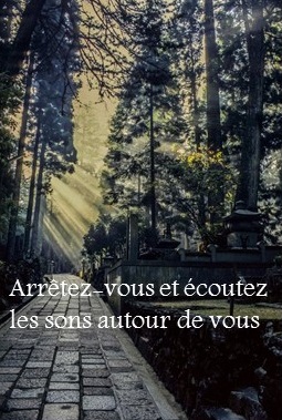 Arrêtez-vous pendant quelques minutes pour écouter les sons autour de vous. Fermez les yeux si vous voulez et écoutez. N’essayez pas d’interpréter les sons. Ceci doit être une expérience agréable alors choisissez un endroit où votre audition ne sera pas saturée par des sons désagréables. On parle de sons ici, pas de voix. Evitez les endroits où il y a des conversations.