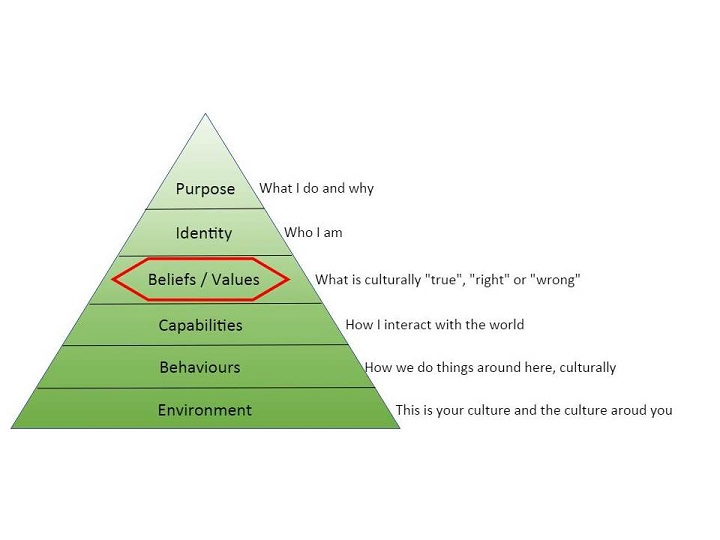 In contrast, reviewing, understanding and adapting your values and beliefs when necessary will allow changing in turn your capabilities, behaviours and environment.
