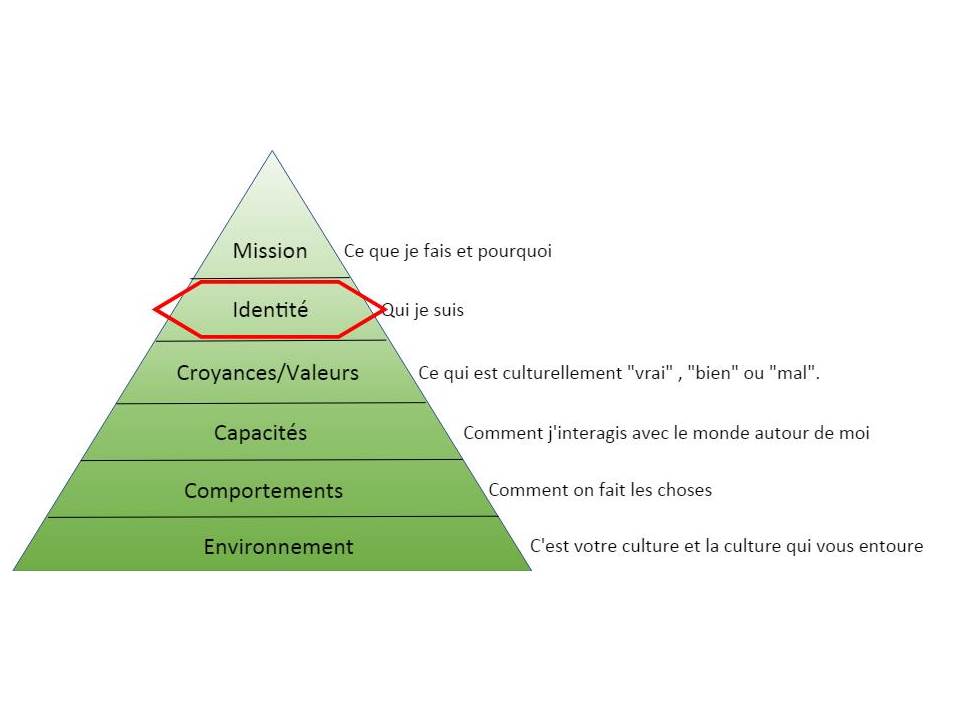 Premièrement, en termes de niveaux neurologiques, une partie de votre identité est ce qui constitue tous les niveaux inférieurs de la pyramide. Vous êtes un mélange complexe de comportements, de capacités, de croyances et de valeurs qui ont façonné qui vous êtes maintenant.